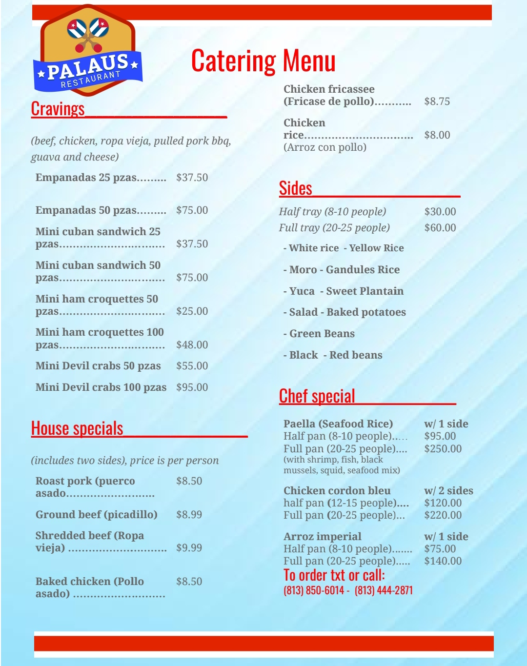 Palaus Restaurant provided exceptional catering for our event. The authentic Cuban cuisine was a hit among our guests, and the service was impeccable. We received numerous compliments on the food and presentation, making our celebration truly memorable. I highly recommend their services for anyone looking to elevate their dining experience!